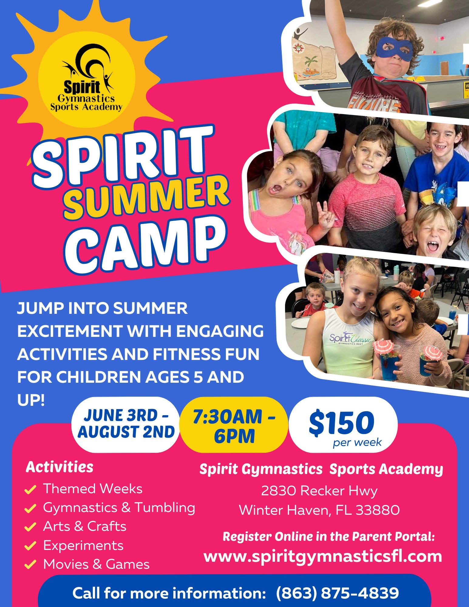 Spirit Gymnastics will be offering Weekly Summer Camps beginning the week of June 3rd, 2024. Camp will begin daily at 7:30 am and end at 6:00 pm. During camp, students will participate in gymnastics lessons, arts and crafts, movie time, game time and many other fun activities. Each week of camp will have a different theme to keep things exciting and interesting.